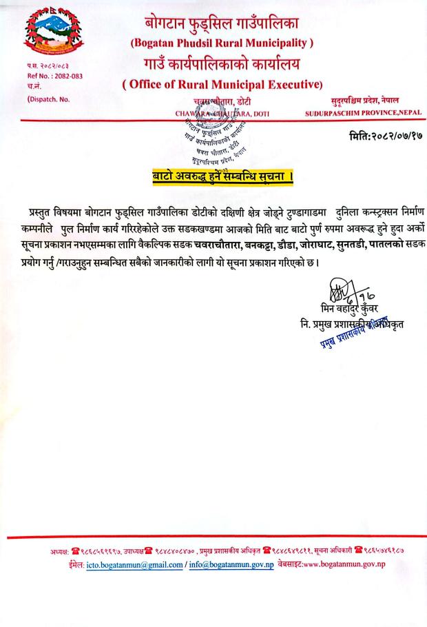 बाटो अवरुद्ध हुने सम्बन्धि सूचना !