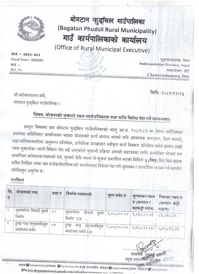 योजनाको भुक्तानी रकम सार्वजनिकरण तथा दाबि बिरोध पेश गर्ने सम्बन्धि सूचना
