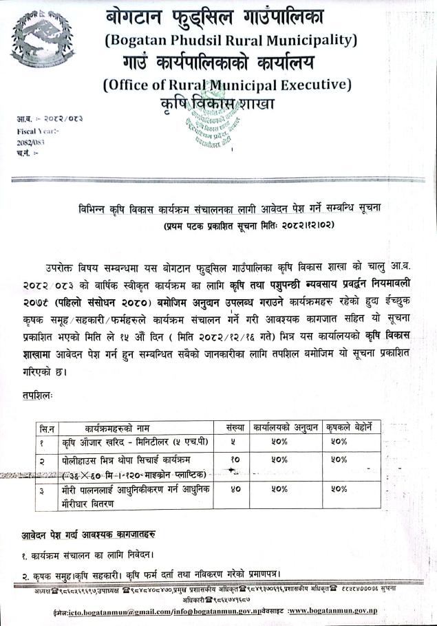 कृषि विकास कार्यक्रम संचालनका लागि आवेदन पेश गर्ने सम्बन्धि सूचना !